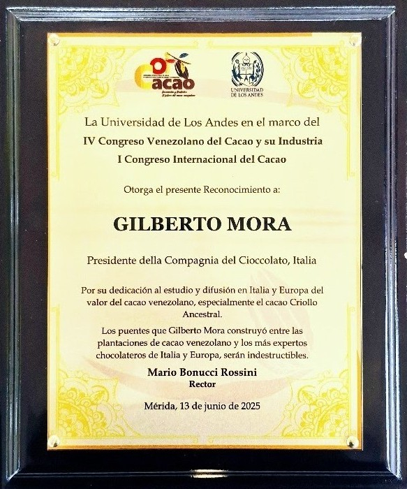 Gilberto Mora presidente di Compagnia del Cioccolato ha ricevuto un importantissimo riconoscimento da parte del Rettore Mario Bonucci Rossini dell'Università delle Ande con sede a Merida in Venezuela, per il suo lavoro di selezionatore delle piantagioni con le migliori varietà di cacao e soprattutto di ricerca dei cacao ancestrali che ha poi diffuso ai cioccolatieri italiani.